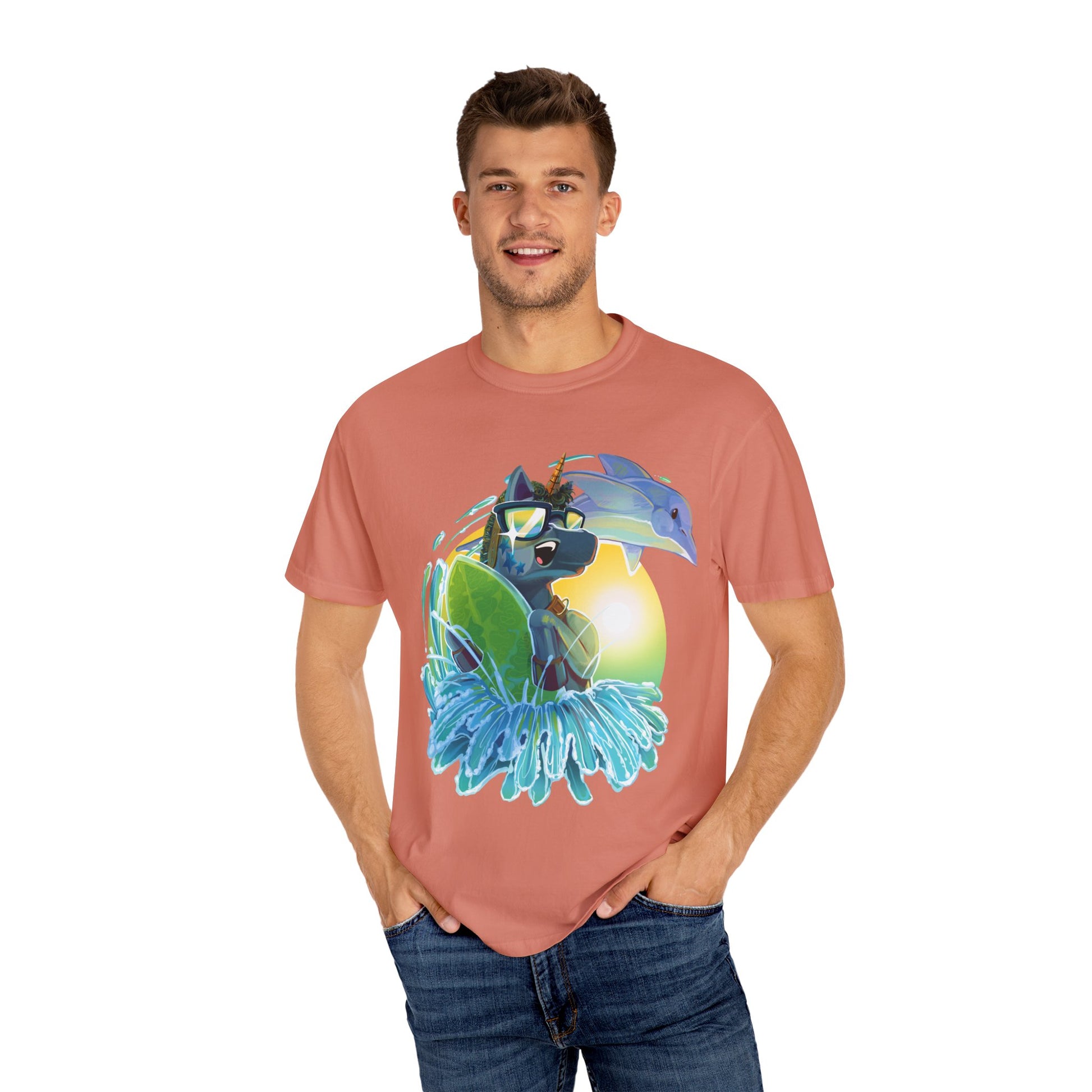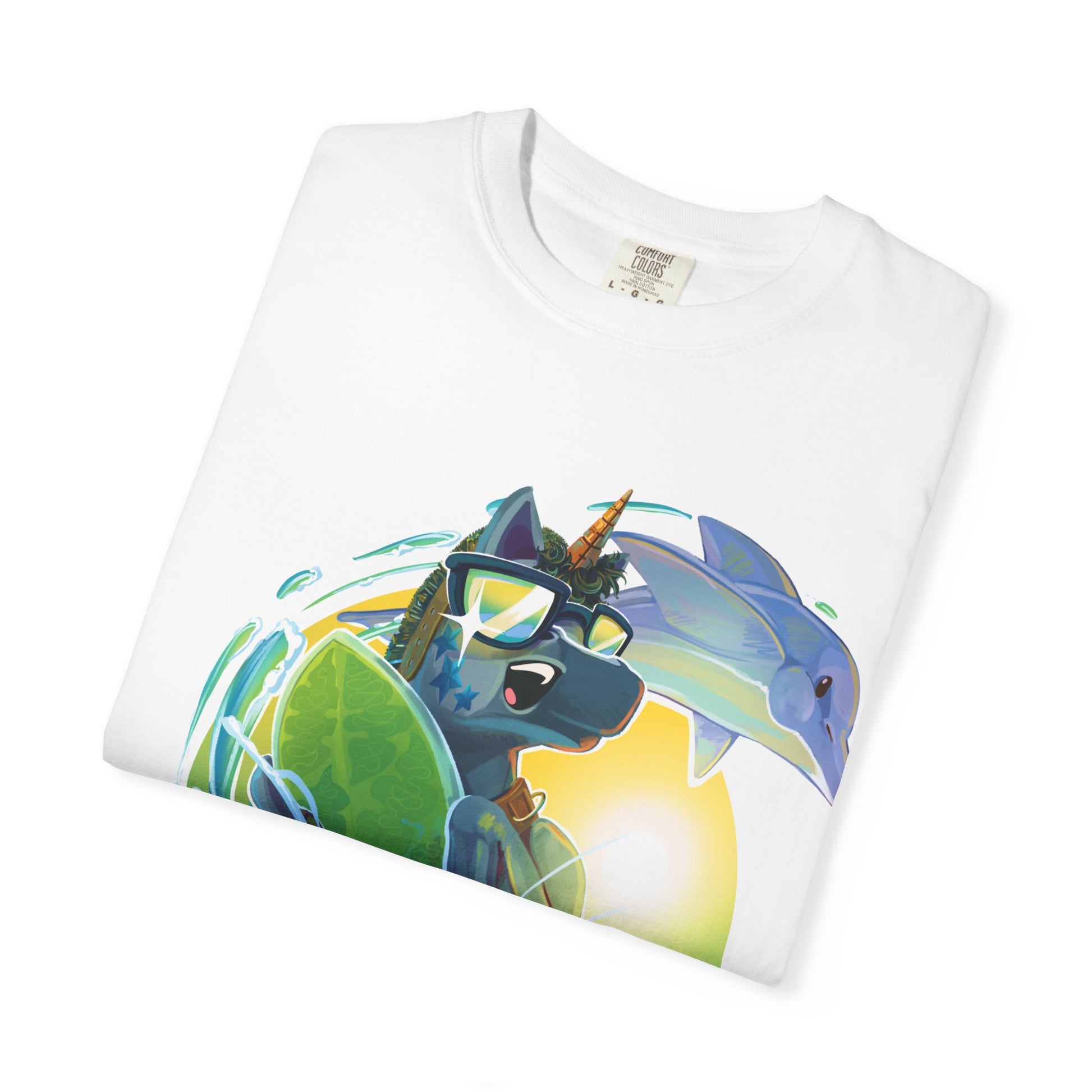 Catch the Waves with Arty the Cool Surfing Unicorn! Featuring Arty the unicorn rocking sunglasses and riding the waves, this unisex garment-dyed t-shirt is the ultimate blend of comfort, style, and whimsical fun. Whether you’re hitting the beach, hanging out with friends, or just lounging at home, this tee brings a laid-back, tropical vibe to your wardrobe.Crafted from 100% ethically sourced US cotton, this t-shirt features soft, garment-dyed fabric that delivers a unique, vintage-inspired look and an ultra-comfortable feel. The relaxed fit and seamless tubular knit ensure a flattering and smooth finish, while the double-needle stitching adds durability for long-lasting wear. With 58 color options, you can find the perfect shade to match your style and celebrate Arty’s cool, adventurous spirit.Whether you’re gifting it to a unicorn fan or adding it to your own collection, this Arty t-shirt is a must-have for anyone who loves magical adventures and bold designs.Key Features:
