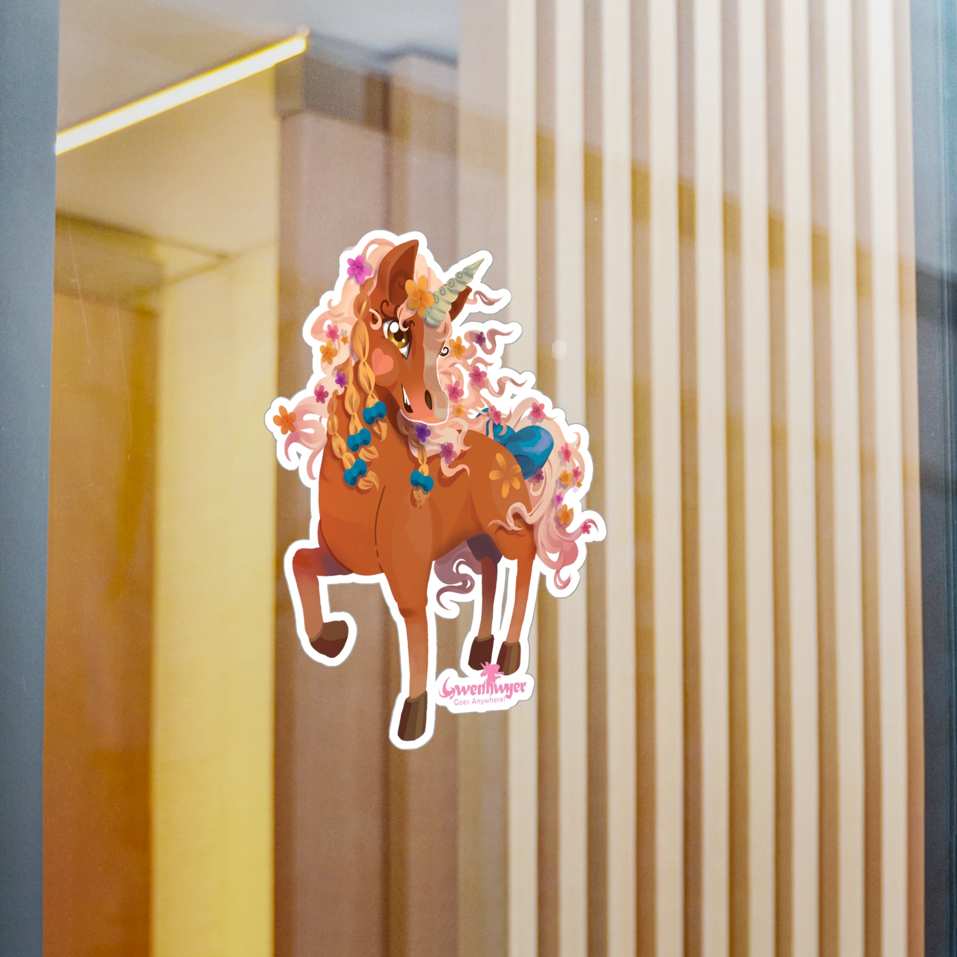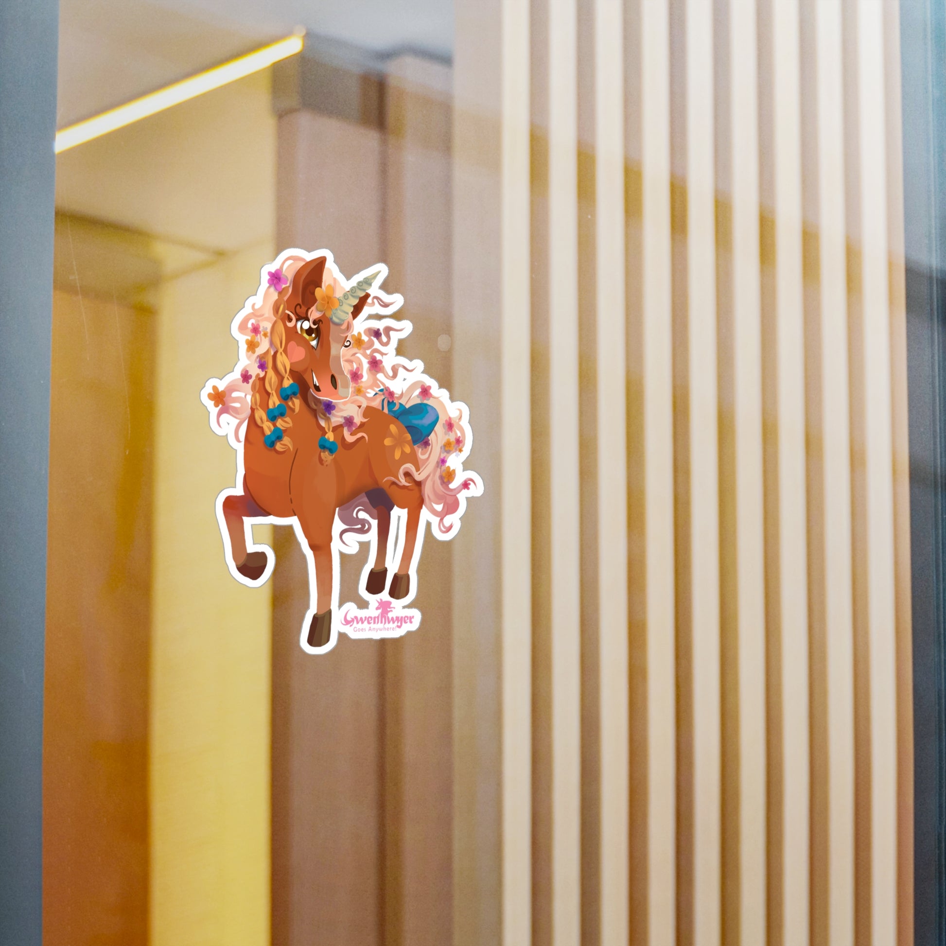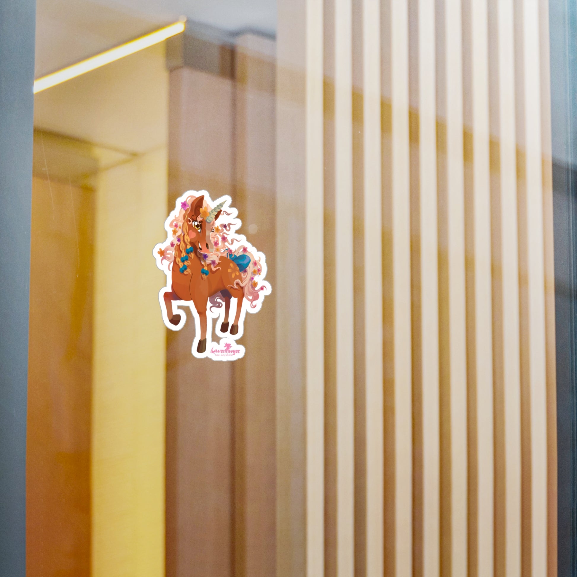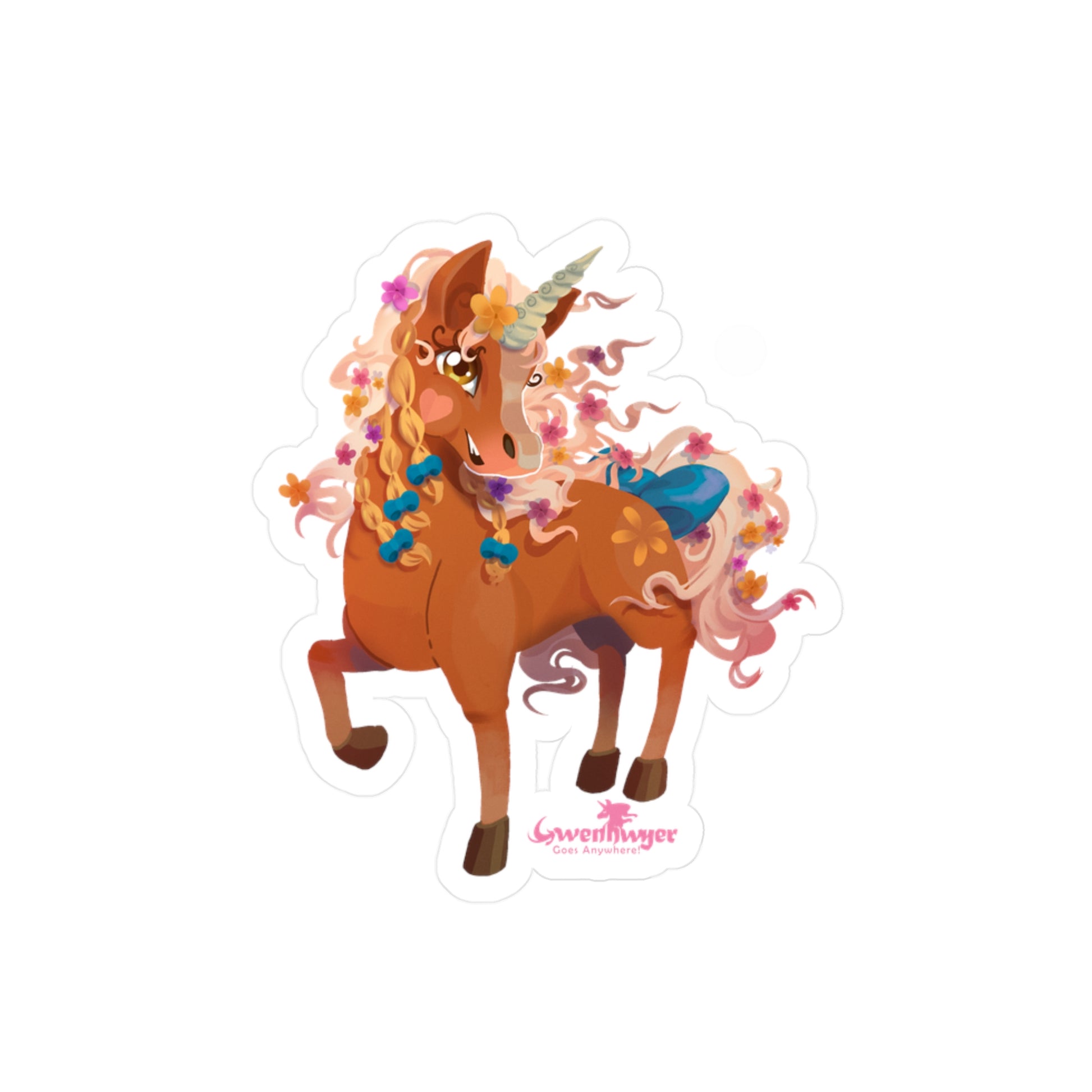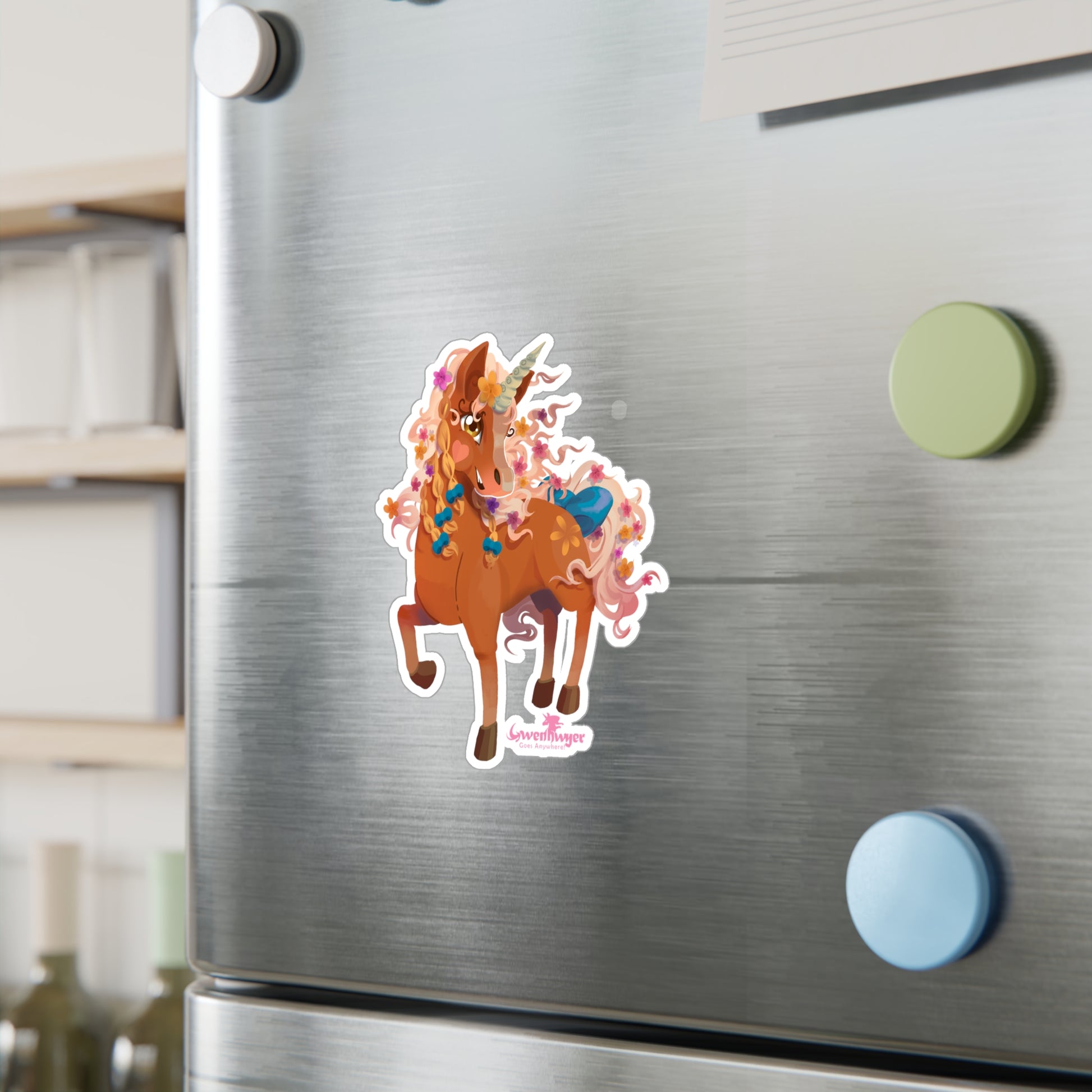 Add Gwenhwyer’s Grace to Your World with This Stunning Sticker! Featuring the beautiful palomino unicorn Gwenhwyer, this high-quality vinyl sticker is the perfect way to bring a touch of magic and elegance to your everyday items. Whether you’re decorating your laptop, water bottle, notebook, or any other surface, Gwenhwyer’s enchanting design will make your belongings stand out.Made from durable white vinyl with a satin finish, this sticker is water, scratch, and UV-resistant, ensuring it stays vibrant and intact even with daily use. The 1/8" kiss-cut border makes it easy to peel and apply, while the removable adhesive ensures no sticky residue is left behind when you’re ready to switch things up. Available in four sizes, this sticker is perfect for customizing your favorite items with Gwenhwyer’s magical charm.Whether you’re a fan of Gwenhwyer’s adventures or simply love unicorns, this sticker is a fun and functional way to express yourself.Key Features: