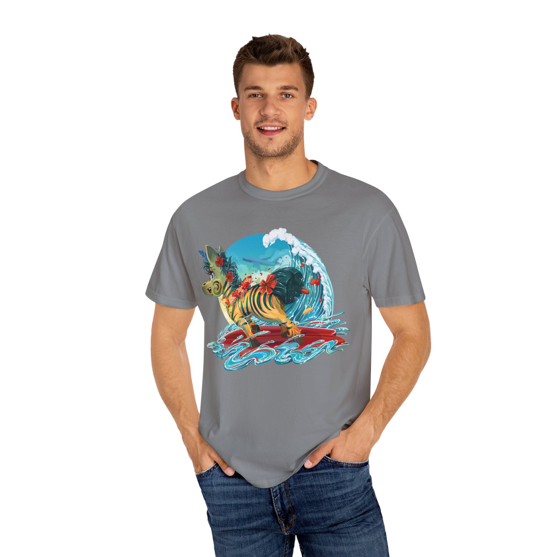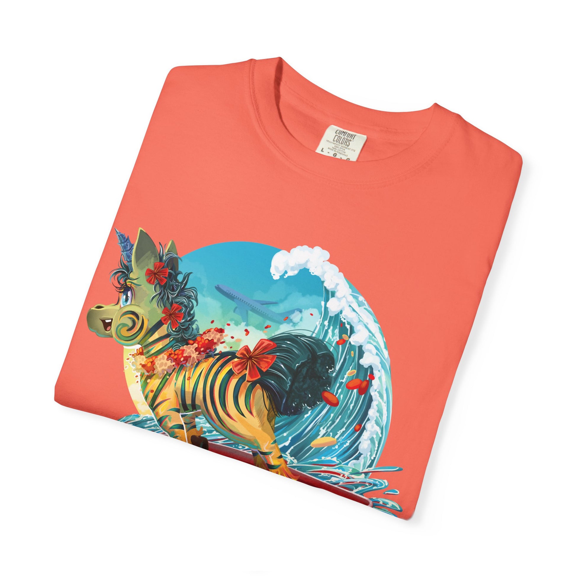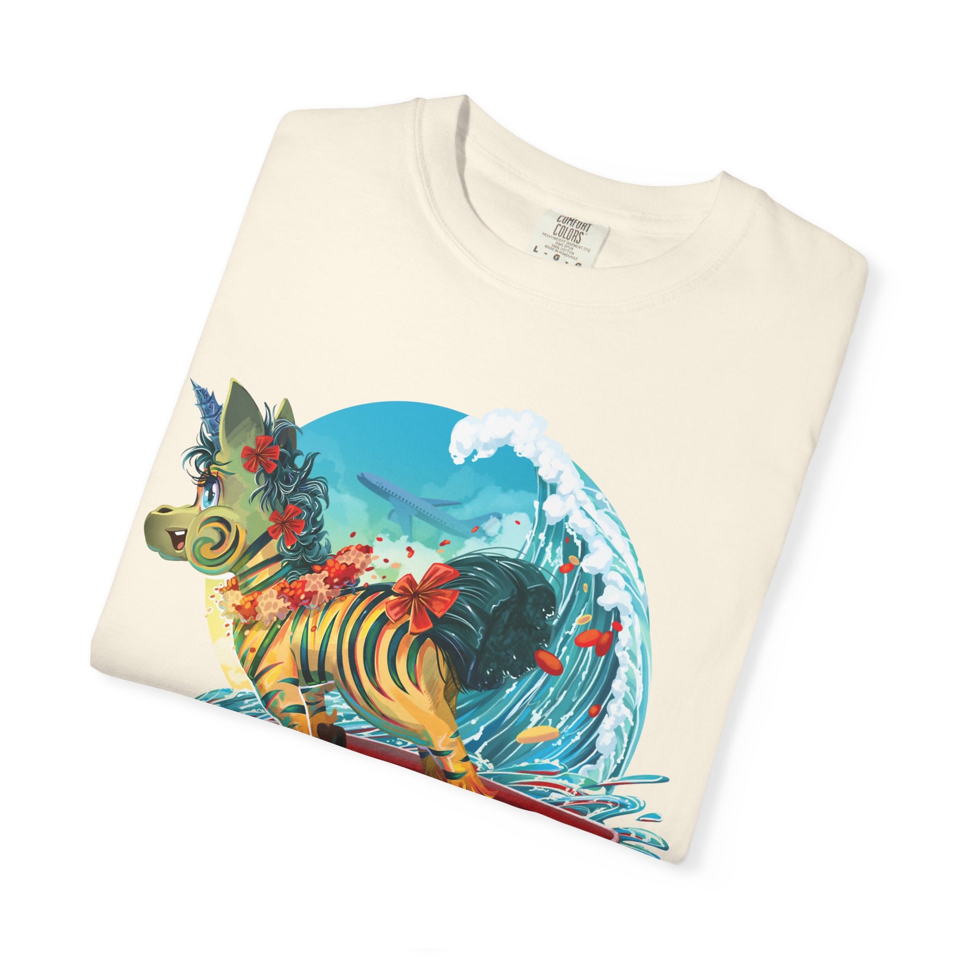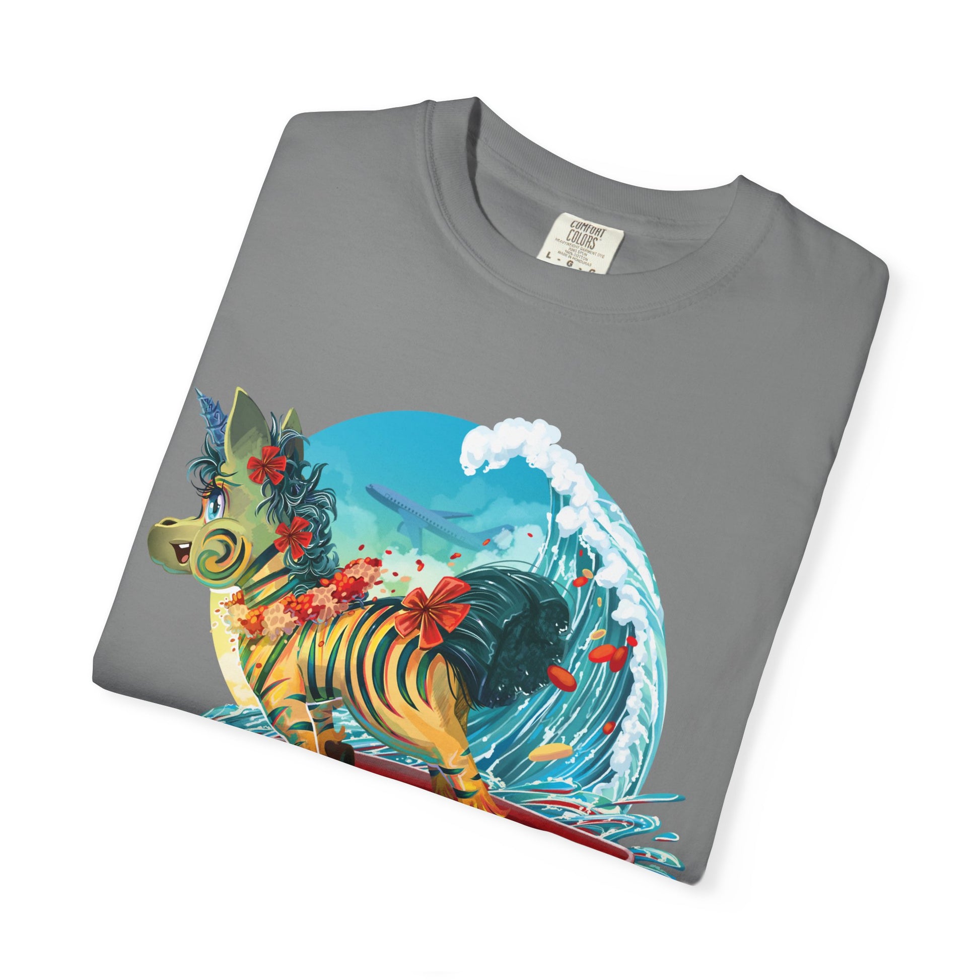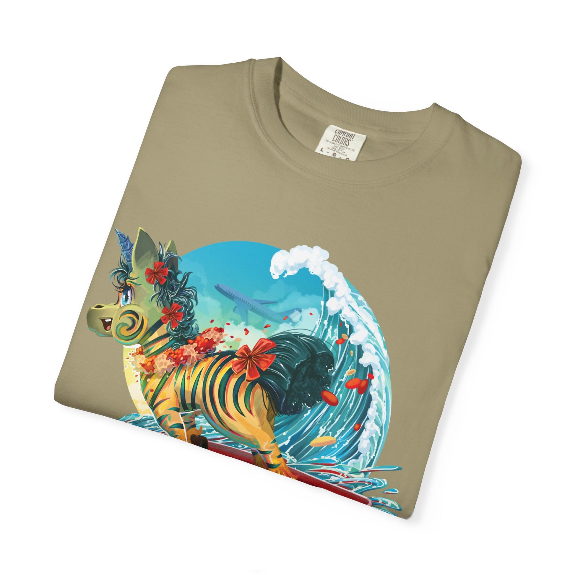 Ride the Waves with LeeNeigh the Surfing Unicorn! Featuring LeeNeigh riding her surfboard, this unisex garment-dyed t-shirt brings a splash of fun and magic to your wardrobe. Perfect for beach outings, casual meetups, or laid-back days, this shirt radiates carefree summer vibes while keeping you stylish and comfortable. Whether you’re a fan of LeeNeigh’s adventures or just love unique designs, this tee is a must-have for anyone who embraces a relaxed lifestyle.Crafted from 100% ring-spun US cotton, this t-shirt features soft, garment-dyed fabric that delivers a rich texture and a vintage-inspired look. The relaxed fit ensures all-day comfort, while the double-needle stitching enhances durability for long-lasting wear. Designed with a seamless tubular knit, this shirt offers a smooth finish and reduces fabric waste, making it a sustainable and stylish choice. Available in sizes S to 4XL, it’s perfect for both men and women who appreciate quality and individuality.Whether you’re gifting it for a birthday, summer celebration, or just because, this LeeNeigh t-shirt is the perfect way to bring a little magic and adventure to your wardrobe.Key Features: