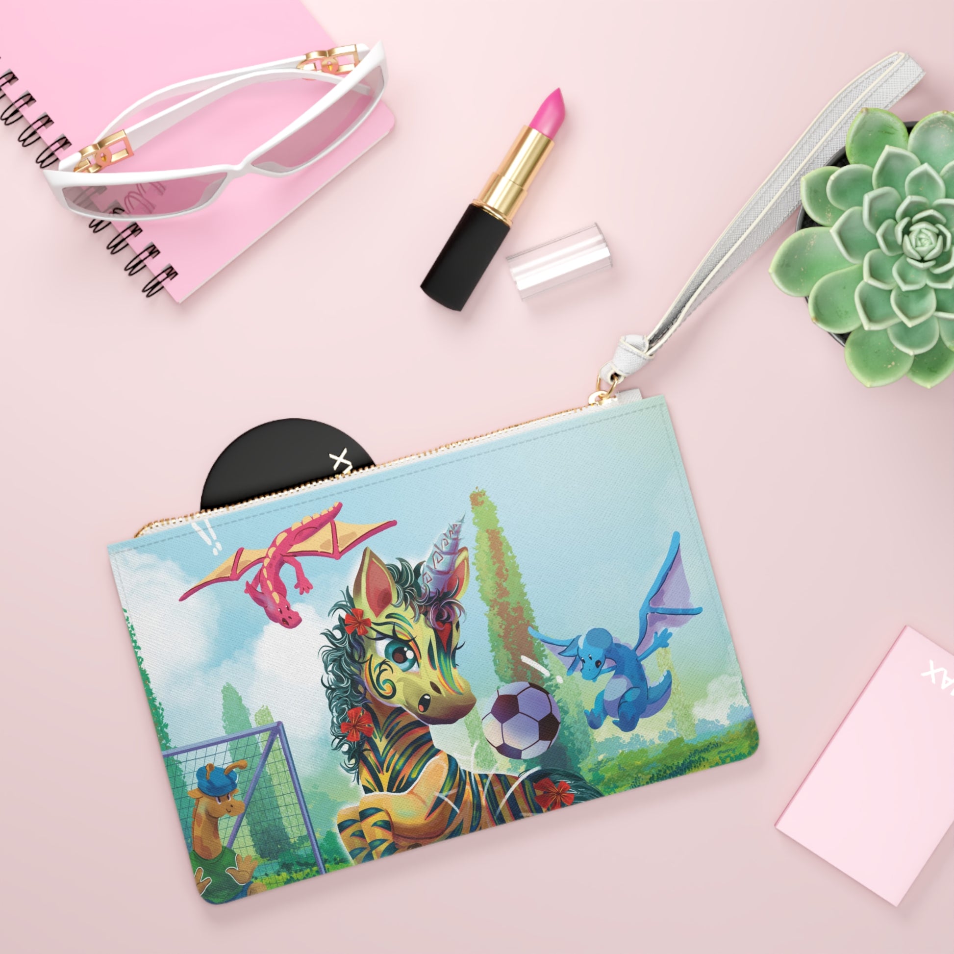 This Clutch Bag featuring LeeNeigh the unicorn playing soccer on the front is perfect for adding a touch of whimsy to your outfit. Ideal for unicorn lovers and those who want a fun accessory for casual outings or special occasions. Great for gifts during birthdays, holidays, and celebrations.