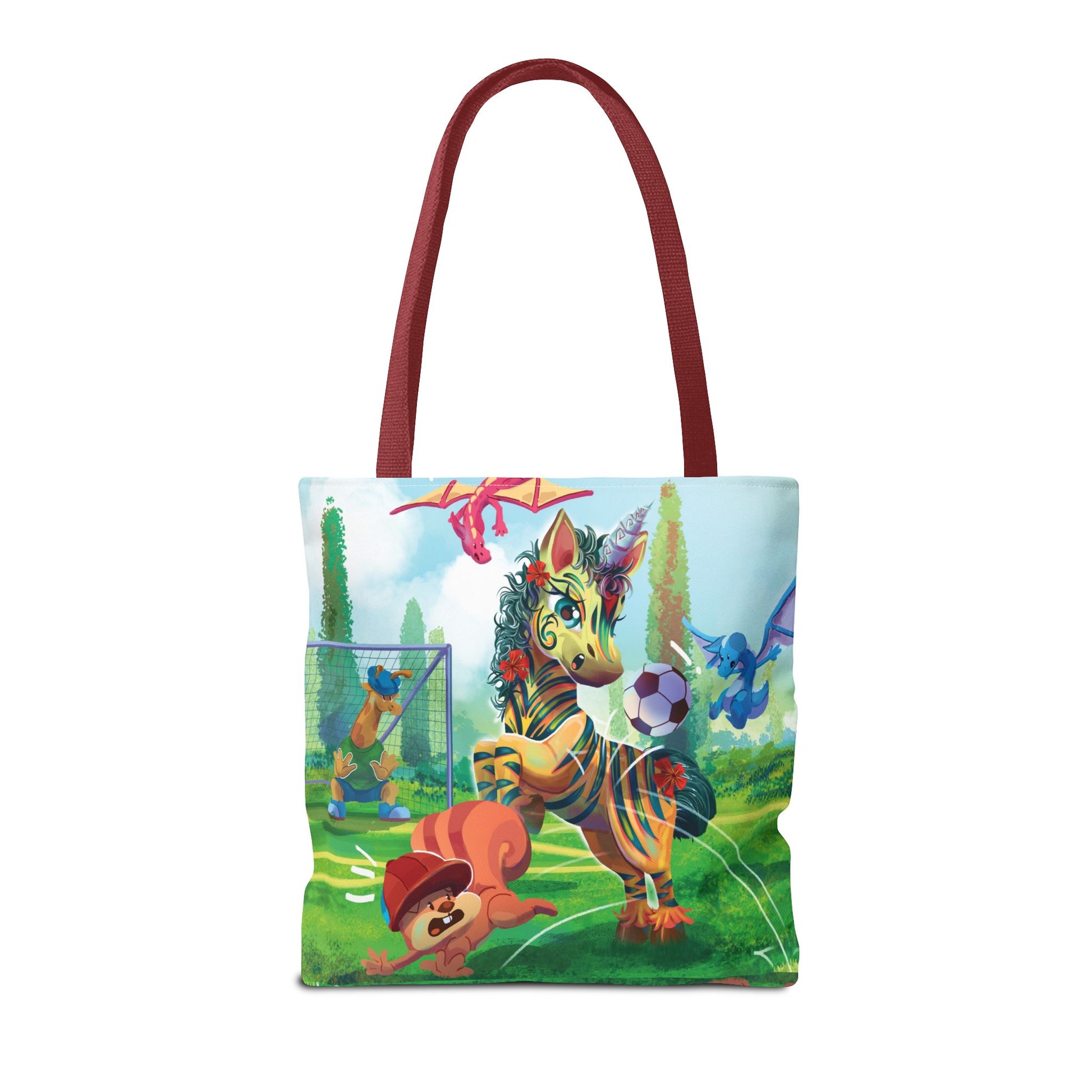Score Big with LeeNeigh the Unicorn Soccer Tote Bag! Featuring LeeNeigh the unicorn playing soccer, this tote bag combines playful charm with everyday functionality. Whether you're heading to the park, running errands, or carrying supplies for your next adventure, this tote bag is the perfect companion for unicorn lovers of all ages.Made from 100% spun polyester, this medium-weight fabric (6.49 oz/yd² or 200 g/m²) is highly durable and designed for daily use. The double-stitched seams and cotton webbing straps ensure long-lasting strength, while the nonwoven laminate lining adds extra durability and structure. Available in three sizes and with five handle color options, this tote bag is as versatile as it is stylish. The all-over print is created using dye sublimation, ensuring vibrant, high-quality visuals that won’t fade over time.With its spacious single compartment, this tote bag is perfect for carrying everything from books and groceries to sports gear and more. Let LeeNeigh’s soccer skills inspire your day while keeping your essentials organized in style!Key Features: